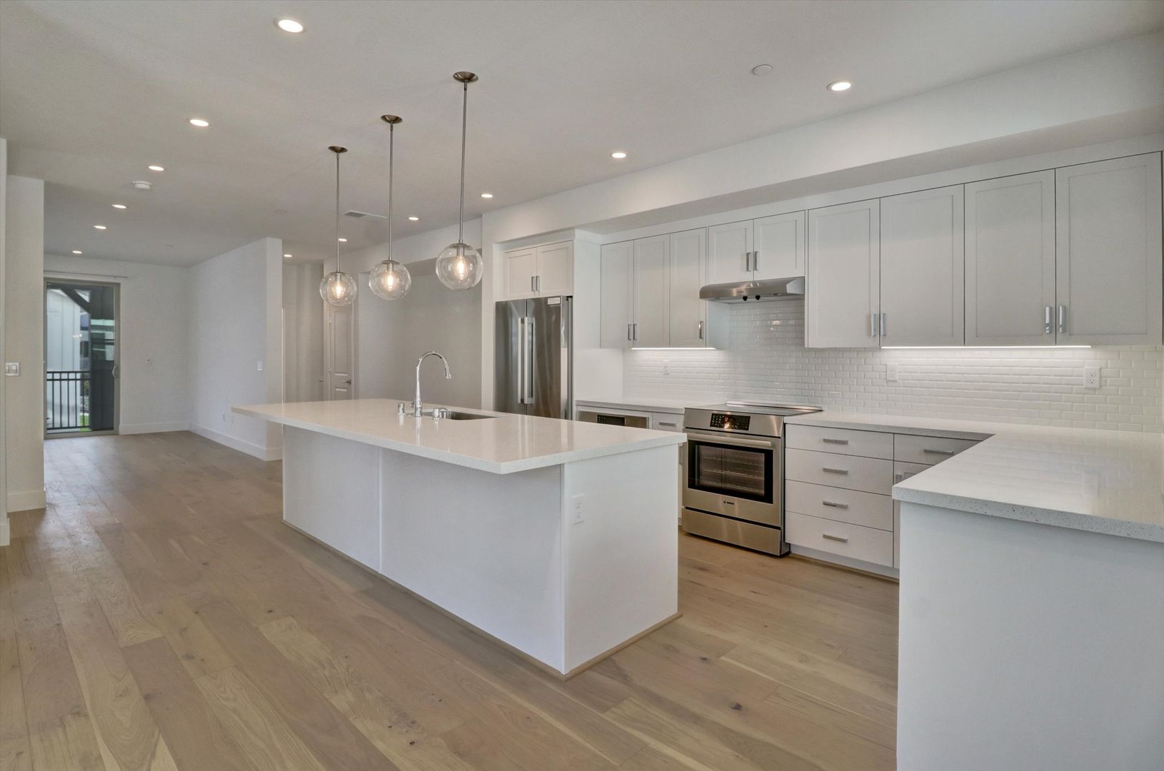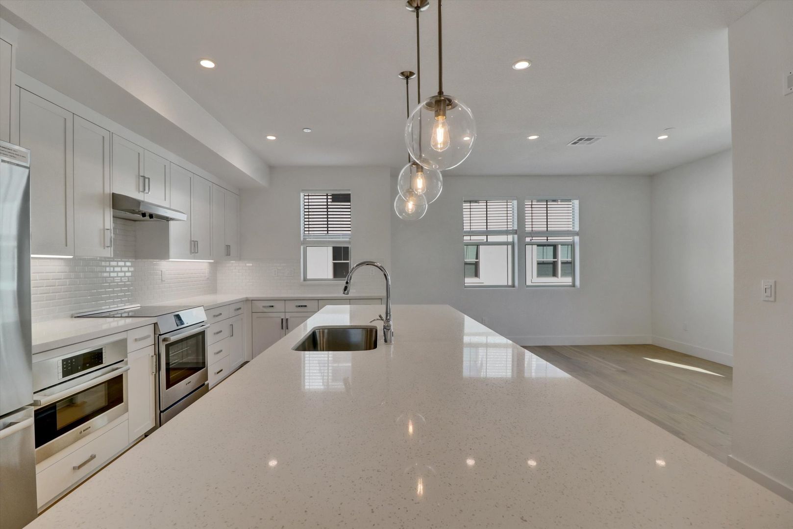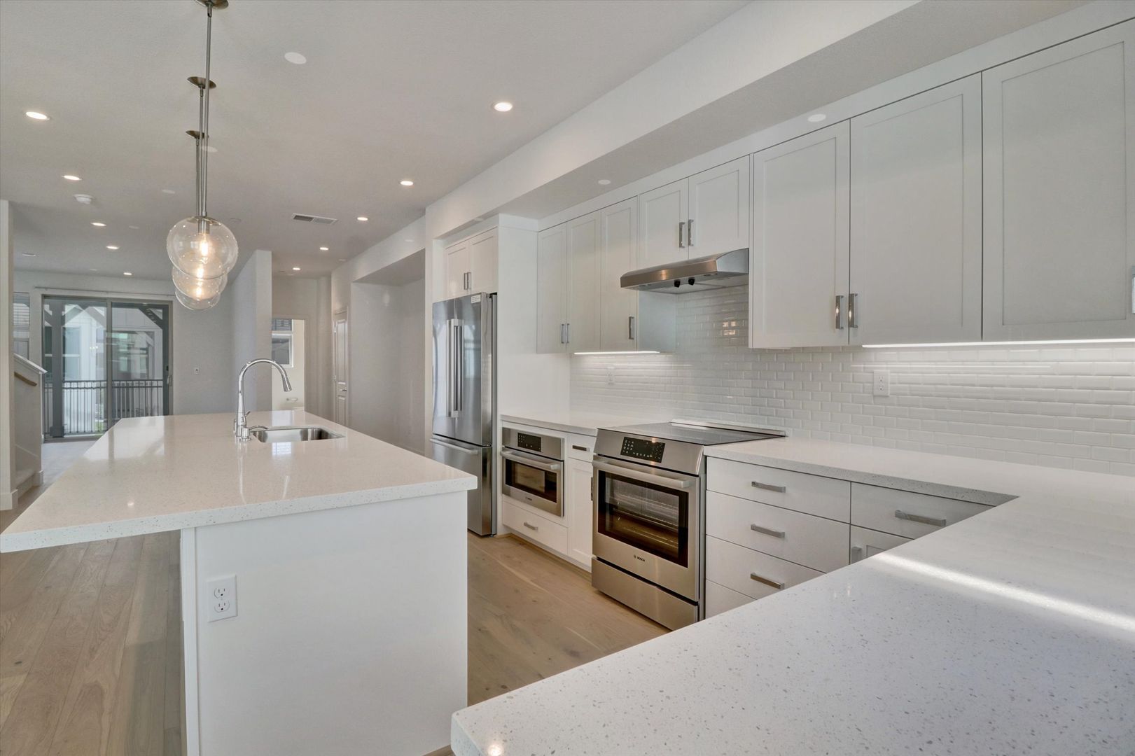 The home boasts a gourmet kitchen with Bosch appliances, a large kitchen island, a covered balcony, and a porch with room for sitting. Additional features include solar panels, an EV car charger, engineered wood floors, full-tiled backsplashes, quartz countertops, recessed lighting throughout, large walk-in closets, and more!